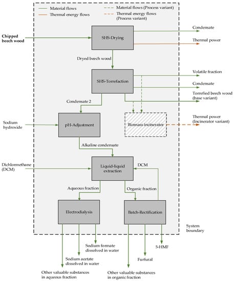 The total annual costs calculated in this manner were counterbalanced against the total annual revenues from the extracted platform chemicals, the torrefied biomass or, in the case of the process variant with an incineration plant, the sales revenue from the heat generated. Only the products shown in Figure 1 were considered for the revenues.