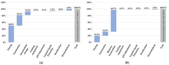 The investment costs were determined from the apparatus costs using two different calculation methods. One method called Hand works with multiplication factors for different types of equipment. The other method, the Plant Component Ratio (PCR) method, uses cost distribution factors for equipment and other trades, such as the foundations, instrumentation or piping of a process plant [37,38,39,40]. The Hand method adds cost factors for indirect investments (e.g., buildings and infrastructure), process investments and risk supplement to the equipment costs to arrive at the total investment costs. The PCR method determines the total investment costs via cost distribution factors between the process engineering apparatus, process design costs, electrical and instrumentation and control technology, construction site costs, etc. [37,38,39,40]. Individual cost distribution factors, such as those for process design and construction site costs, were adjusted after the results were provided in order to arrive at realistic values. The absolute process design costs, for example, could be estimated by the authors themselves based on experience developing similar plants. The biorefinery should be constructed from as many standard components as possible, and the individual process units should be delivered to the site completely pre-assembled on frames (skid-mounted) in order to minimise the assembly effort and thus the costs at the construction site. For the process variant, only a completely supplied biomass incineration plant including flue gas cleaning is added in terms of investment. Due to the high additional costs for the incineration plant compared to the biorefinery, the surcharges for the Hand method were adjusted for the total investment costs of the variant so that realistic absolute values are given. The same applies to the variant for the cost allocation factors for the PCR method. Two offers were obtained for the biomass incineration plant and verified with the specific investment costs from Ref. [46]. The mean values for the investment costs were then calculated from the two investment cost methods according to Ref. [37] for the reference case and the process variant with biomass incinerator. These were depreciated over 20 years and assigned to the fixed operating costs. These annual depreciation costs represent the only CapEx factor.