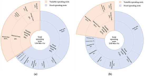 In both variants, personnel costs account for the largest share, followed by the costs for biomass woodchips residues. The energy costs burden the reference case with 10% and can be significantly decreased to less than 4% in the process variant with thermal self-supply. For electricity, a price of 18.25 Eurocents per kWh was used [51], and 3.96 Eurocents per kWh was used for natural gas [52]. In the process variant, the capital costs of more than 13% and depreciation of 10% of the total costs have a considerable impact due to the significantly higher investment costs. All other cost shares are well below 10%.