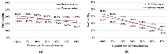 Because material costs are usually linked to energy costs, a variation between minus 10% and plus 50% was also considered here (see Figure 4b). Material costs have a much greater impact on profitability than energy costs. Here, as well, the reference variant is more affected by price increases. In the range considered, profitability decreases by about 11 percentage points for this variant and by almost 9 percentage points for the variant with an incineration plant. Even with a 50% increase in material prices, profitability still remains above 10%.