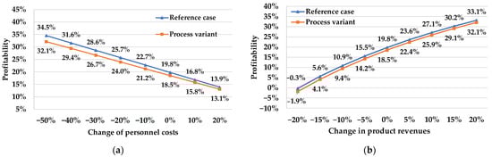 The sensitivity analysis also considered the case in which the biorefinery is operated in an industrial network. In this case, personnel capacities can be shared, and thus the proportional personnel costs can be reduced. Figure 5a shows the influence of personnel costs. The basic calculations assume a self-sufficient operation of the plant with complete staffing. A range of plus 20 to minus 50% was considered for the sensitivity analysis of personnel costs. An increase in personnel costs by 20% reduces profitability by about 5 to 6% in both variants. A 50% reduction in personnel costs increases profitability by 13 to 15%, whereby the basic variant benefits more from lower personnel costs.