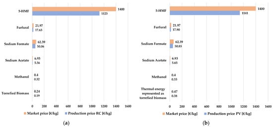 The first part of this publication series examined how the primary energy demand and CO2 emissions of the new biorefinery are distributed among the individual products generated. In this economic part of this publication series, an analysis was therefore made of how the operating costs of the plant are distributed among the individual products according to Ref. [47]. Such an analysis reveals whether all products provide a contribution margin or whether particularly profitable products have to compensate for less or non-profitable ones. For this allocation, a distribution of product volumes and another distribution of relative market values were generated from Table 2. Torrefied biomass has the largest production mass share of all products at over 97%, but it has the smallest share of the total market price per ton at 0.016%. The torrefied biomass was set to an equivalent value of 1 due to its smallest market price share, and all other products were set relative to the market price share of this reference product. This results in an equivalence value of 5833 for the most expensive product 5-Hydroxymethylfurfural (5-HMF) which has a mass share of 0.0073% and a total market price share per ton of 93.84%. The sales units can be calculated by multiplying the individual equivalent values by the annual output of each product. The total cost per year is then divided by the total number of sales units to obtain the total cost per sales unit, which is 0.1925. The equivalence numbers can then be multiplied by the total cost per sales unit to determine the production costs for each product shown in blue in Figure 6. For instance, the equivalence value of 5-HMF is multiplied by 0.1925 to obtain a production price of 1123 €. The thermal energy produced had to be related to the torrefied biomass, which is energetically recovered by combustion, in order to keep the relation to one unit (kg/h). The thermal energy is then allocated using the aforementioned method, which has a market price share of 0.031%, nearly twice that of torrefied biomass. The allocation shows that all products provide a positive contribution to profit in the reference case as well as in the variant with incineration plant.