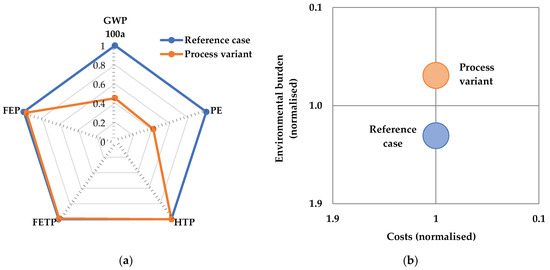 Figure 7b depicts the eco-efficiency portfolio of both operating variants considered. This profile was created according to references [48,49,50]. The values of the LCA and the sum of operating costs and revenues (indicated as “costs”) are normalised in relation to each other, with the worst performance being assigned a value of 1 in each case. From this, the normalised mean values for the environmental impacts and the normalised mean values for the costs are calculated. Because there are five environmental impact categories, each must be weighted. Climate change (GWP) was weighted at 40%, primary energy demand (PE) at 30% and the remaining three at 10% each. The individual results are then related to the mean value and multiplied by the individual weighting factors in the case of environmental impacts.