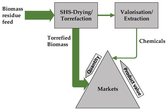 For an environmentally friendly and economic use of biomass-residues, it is necessary to develop cross-sectoral valorisation visions [24]. It is therefore important to concentrate on high-quality products on the one hand and to increase the spectrum of products for the solid and liquid fractions obtained on the other [9]. It has been widely discussed in the literature that a diversification strategy and the extraction of a range of products with maximum total value from biomass, combined with a good business model, significantly improves the feasibility of biorefineries in economic terms [20,34,35]. Although research on biomass torrefaction is increasing recently, there is a lack of information on the integration of the technology within an overall biorefinery concept for specific applications [15].