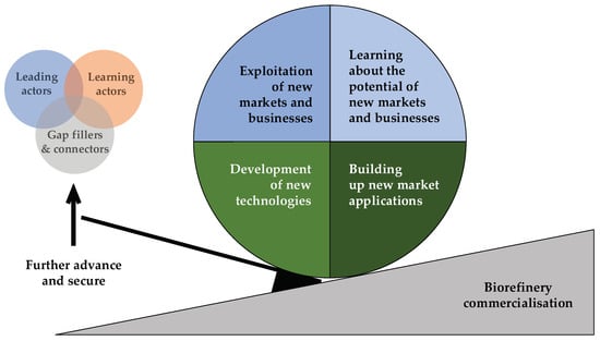 The majority of biorefinery plants are still under development, at pilot or demonstration scale. Established research does not address the immediate challenges at this level of development. Even the literature on technology and innovation management is scarce in this regard. However, pilot and demonstration scale are important and necessary to raise industrial interests and encourage collaboration between different actors, i.e., industrial companies, academia, public authorities and equipment industry [17,18]. Robust biorefinery concepts can only be realised through a multi-layered approach that takes the relationship between biorefinery configurations, economic performance and future uncertainties into account [16]. Aspects of the innovation system in the biorefinery environment that have been weak so far are primarily resource mobilisation and market formation [9]. Therefore, new markets and businesses need to be developed and their potential needs to be assessed. This in turn requires that new market applications are established and new technologies are developed [19]. Ref. [19] conducted an exploratory case study specifically for a biorefinery in Germany. They focused on the company actors and found that the combination of leading actors, learning companies and gap fillers from the SME or start-up sector was an important success factor. Investments in new technologies with long payback periods need to be made by mature industries that have alternative investment opportunities available [9]. Established companies are seen as playing a crucial role in the commercialisation of new technologies because no market entry would take place without an adaptation of their strategies and business models [20]. The presence of “gap fillers” is an indication of partnership-based strategic system-building activities, where suppliers and manufacturers integrate complementary resources to jointly create products and markets [21]. The innovation system must be able to mobilise the necessary resources while creating supply and demand [20].