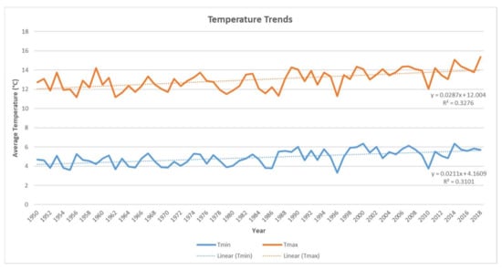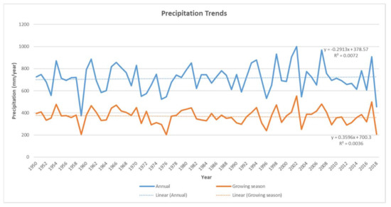 Observational data (eobs-v19.0e) [42] averaged over NELS show the historical temperature and precipitation trends. For the period 1950–2018, the annual average minimum and maximum temperatures have followed an incremental trend (Figure 2). The total annual precipitation, for the same period, shows a slightly increasing trend while the total precipitation during the growing season (March to August) has followed a slightly decreasing trend (Figure 3). These observations align with the trends identified by Trömel and Schönwiese (2008) [41].