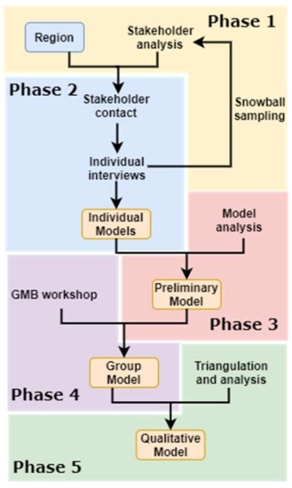 The five stages of our approach to GMB process, from top to bottom. First, the stakeholder analysis phase. Second, the individual interviews producing individual models. Third, the analysis of the individual models to produce the preliminary model. Fourth, the GMB workshop to generate a group model. Fifth, the triangulation and analysis to build the qualitative model.