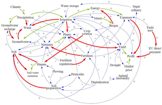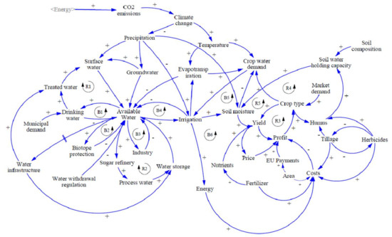 Several stakeholders suggested a new crop rotation or diversification of crops as an adaptation measure because of the high water consumption of current crop rotation. Diversification of crops increases the resilience to climate change and drought [75,85,86]. The effect current crops have on water demand is represented in both the preliminary and the group model (Figure 5 and Figure 6). While current crop rotation has a high water-demand, a stakeholder also mentioned that a large proportion of the current infrastructure is built around these crops. Farmers mentioned their reluctance to change crops because it could have a large impact on crop yields and subsequently on their profits (Figure 5). This mirrors the observation in Scandinavia by Ibrahim and Johansson (2021) [29]. While, changing crops could reduce water demand, these changes are costly and could lead to rebounding maladaptation due to the incompatibility with market demand [87]. Market demand incompatibility could also lead to maladaptation through a shift in vulnerability, as the local sugar refinery and the biogas plants, two of the strongest buyers of farmers’ yields, depend on sugar beets and maize.