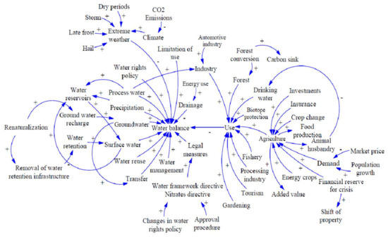 For our second objective, several adaptation measures were observed in the preliminary and group models and mentioned by stakeholders (Table 2). The most frequently mentioned adaptation measure was the creation of water storage infrastructure, which is present in both the preliminary and the group models (Figure 5 and Figure 6). By storing water, which might come from water treatment plants or industry, the available water of the region could be increased. This could decrease the pressure on groundwater by reducing the need for extracting groundwater for irrigation. The local sugar refinery has already created a water reservoir to store process water, which is later used for irrigation. The water reuse project implemented by the sugar refinery demonstrates the successful incorporation of water storage projects. However, while water reservoirs for agriculture can support climate change adaptation they require high capital investment and have high social and environmental costs [77]. Besides, the scale of this particular project is currently too small to have a significant effect on the amount of available water in the region (Figure 5).