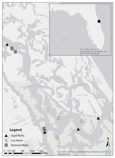 - Garvis, S.K.; Sacks, P.E.; Walters, L.J. Formation, Movement, and Restoration of Dead Intertidal Oyster Reefs in Canaveral National Seashore and Mosquito Lagoon, Florida. J. Shellfish Res. 2015, 34, 251–258. [Google Scholar] [CrossRef]