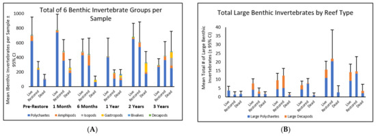 Total number of (A) all 6 groups of benthic invertebrates for each reef type for all sampling periods and (B) mean totals of larger benthic invertebrate organisms (polychaetes length ≥ 1 cm and decapods with carapace width ≥ 0.5 cm) by reef for each of the sampling periods. Different colors within the bars represent the totals for each benthic invertebrate group. Error bars represent 95% confidence intervals.