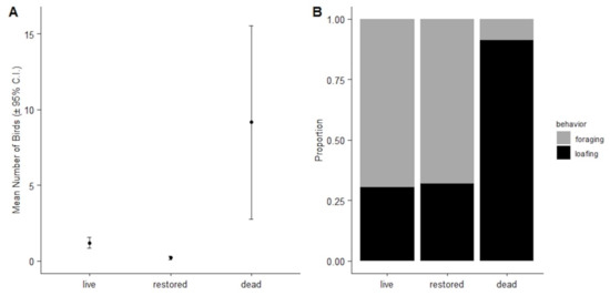 Bird behaviors differed by reef types. The proportion of birds foraging was higher on live and restored reefs, while the proportion of birds loafing was higher on dead reefs (p = 0.017; Figure 3).