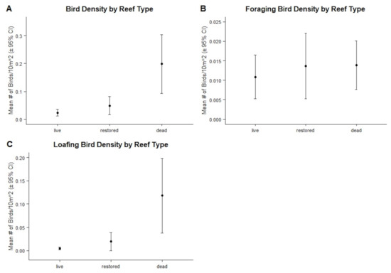 Comparisons of mean total bird densities (A), mean foraging bird densities (B), and mean loafing bird densities (C) between each reef type. Error bars represent 95% confidence intervals. Overlapping error bars indicate similarities between reef types.