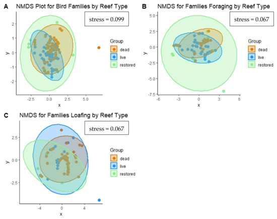 NMDS ordination plots for (A) all bird families, (B) foraging bird families, and (C) loafing bird families observed on live, restored, and dead reefs. Points represent community assemblages on each reef type for each survey event. Ellipses represent 95% confidence intervals for reef type groupings.