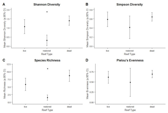 Comparisons of mean (A) Shannon diversity, (B) Simpson’s diversity, (C) species richness, and (D) Pielou’s evenness for live, restored, and dead reefs. Error bars represent 95% confidence intervals. Differences significant at the p < 0.05 level are indicated by *.