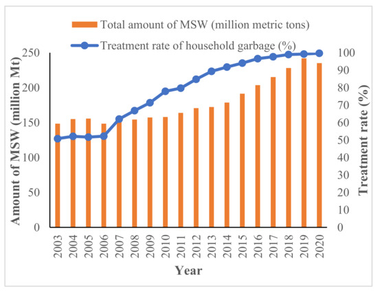 In China, the management of MSW is the responsibility of the central authority, including with regard to collection, transportation, and treatment [17]. However, during the process, solid waste treatment is influenced by economic development, environmental policy, and public environmental awareness [18].