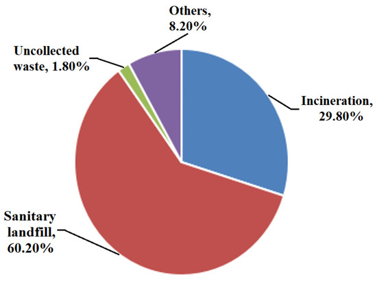 Landfilling is the main method for the disposal of MSW in China (Figure 4). However, in remote areas, uncontrolled landfills still exist where waste is disposed of without any control measure. Local landfills still encounter difficulties, such as digestive cells filled with unsorted MSW and high amounts of leachate during rainy seasons. This disposal method causes leachate infiltration into the groundwater, leading to secondary pollution.