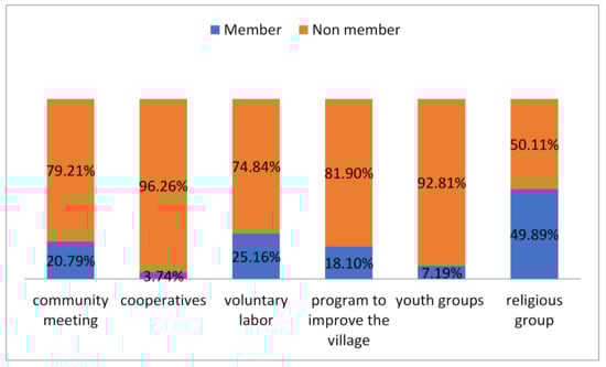 In this exploration, social capital is measured by the membership to six essential community associations, namely community membership, community meetings, cooperatives, voluntary work, village/neighborhood improvement programs, youth groups, and religious activities. These associations can be found in many developing countries across the globe [39], and they can improve subjective well-being through increasing health status, education, literacy, sanitation, financial capital, and individual or community relationships [40]. More access to the resources from networking in those activities is associated with higher social capital. Similarly, Kawachi, et al. [41] explain how a community’s social capital influences the quality of life. To begin with, social capital acts as a conduit for the dissemination of well-being-related knowledge and information. Second, social capital can be used to preserve norms and impose social control over potentially harmful behaviors. Third, social capital enables access to services and amenities because cohesive neighborhoods are more adept in organizing collective actions to promote the development of and access to livelihood resources. Fourth, social capital facilitates psychosocial processes, such as forming social support and mutual esteem.