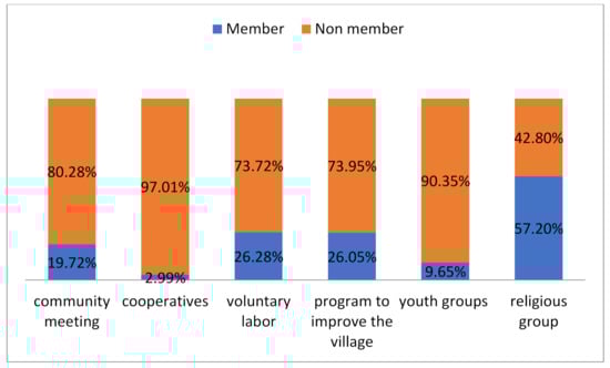 Nevertheless, residents in rural areas have significantly higher social capital (see Figure 1 and Figure 2). As mentioned earlier, there are six community associations in this study. The most popular community association in the urban areas is religious groups with 49.89% membership, followed by voluntary work (21.16%), and community meetings (20.79%). Meanwhile, in a rural area, the most popular membership is religious groups (57.20%), voluntary work (26.28%), and village improvement programs (25.05%). As for cooperatives, only 3.74% of urban people and 2.99% of rural people are members.