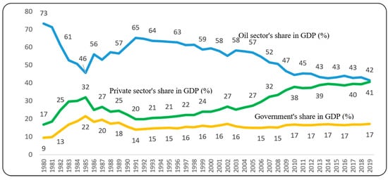 Saudi Arabia’s economy has evolved significantly over the last two decades. The non-oil private sector was initially small, but its growth has outpaced that of the overall economy, with annual real GDP growth of 4.3% from 1980 to 2019. By comparison, real oil GDP grew at a rate of 1.2% over this period. The changing shares of oil and private sector GDP in the total GDP reflect the Saudi economy’s transformation and highlight the private sector’s role in the economy. The non-oil private sector’s contribution particularly increased since 2003. The Saudi economy benefited from the sharp rise in oil prices between 2003 and 2013 before the oil price collapse in 2014. Government spending increased during this period, which helped boost private sector activity (see e.g., [31,32]). Owing to the development of the industrial and services sectors, among others, the oil sector’s relative size has fallen since 2003.