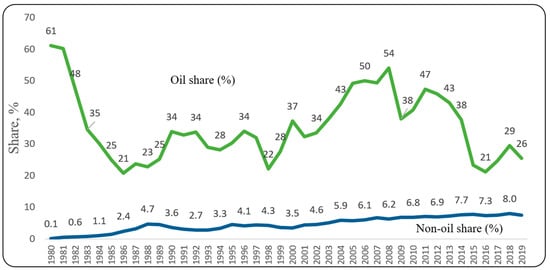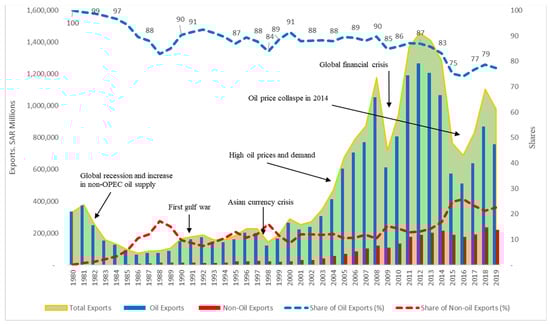 Figure 3 presents the shares of oil and non-oil exports in Saudi Arabia’s total exports. During the 1980s, oil exports accounted for 93% of total exports on average, but this share exhibited a decreasing trend. For instance, in 1980, oil exports accounted for approximately 99% of all exports, but by 1989, this share had fallen to 85%. The demand for oil from Saudi Arabia and other OPEC countries collapsed after 1981 owing to high oil prices [33,34,35]. Between 1981 and 1985, Saudi Arabia’s oil exports fell from 9 million barrels per day (MMb/d) to less than 3 MMb/d. In the 1990s, oil exports accounted for 89% of total exports on average, ranging from 84% to 90%. Oil exports increased in the early 1990s to fill the supply gap created by the embargo on Iraqi and Kuwaiti oil. In the 2000s, Saudi Arabia’s oil and total exports steadily increased since 2004 owing to rising global oil prices and international demand for oil. In 2008, the contribution of oil exports to total exports reached 90%. However, Saudi Arabia’s exports were significantly affected by the oil price collapse in 2008 due to the global financial crisis. Oil prices collapsed again in 2014–2016 owing to a supply glut. Figure 3 also shows the Saudi economy’s progress toward export diversification over the last four decades. The share of non-oil exports in total exports increased from an average of 6.8% in the 1980s to 11% in the 1990s. Non-oil exports have increased on average since 2003. Its share remained fairly steady from 2000 to 2010 but increased to 19% on average from 2010 to 2019. The private sector’s growing contribution to the overall economy over the last decade, however, is not fully reflected in the share of non-oil exports in total exports. This result may be due to the low added value of exports. The petrochemical sector comprises a major share of non-oil exports, while the construction and agriculture sectors have quite small shares.