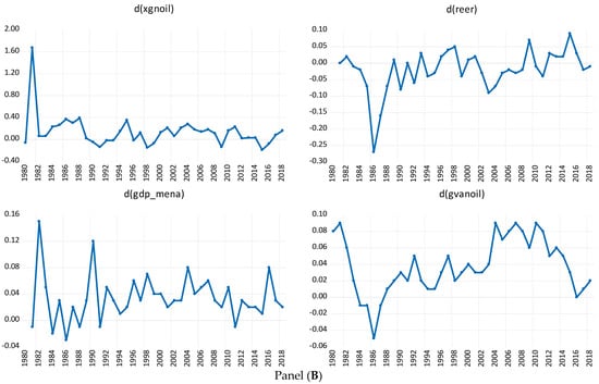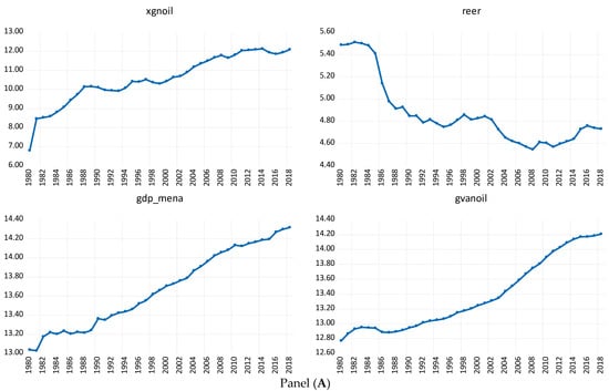 We use annual data for the variables for the period from 1980 to 2018. Following previous studies, we use the REER as a measure of the real exchange rate. The REER is a more comprehensive measure than the bilateral real exchange rate. REER is also considered as a measure of price competitiveness in the international trade literature. To measure foreign income, we consider the real GDP of Middle Eastern and North African countries rather than that of all of Saudi Arabia’s trading partners. This choice is because Saudi non-oil exports are mainly directed to Middle Eastern and North African countries. For example, [5] data show that, on average, over 27% of non-oil Saudi exports from 2005 to 2019 were to the other five GCC countries.