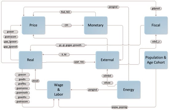 The KGEMM is a policy tool that assesses the impacts of internal decisions by Saudi policymakers and changes in the global economy on Saudi Arabia’s energy-macroeconomic environment [100]. It is a general equilibrium, energy-sector augmented, hybrid macroeconometric model that combines theory-driven and data-driven approaches. A number of studies discuss that a hybrid type macroeconometric model outperforms a purely theory-based model such as a dynamic stochastic general equilibrium model or a computable general equilibrium model, and a purely data-based model such as an unrestricted VAR [25,26,27,101,102,103]. The KGEMM contains eight interacting blocks that represent Saudi Arabia’s macroeconomic and energy linkages, as Figure 5 schematically illustrates. The model includes more than 700 annual time series variables that are classified as endogenous or exogenous. The exogenous variables mainly represent domestic policy, global energy and the global economy. The endogenous variables are determined by behavioral equations that are estimated econometrically or identities that are mainly constructed based on the System of National Accounts. The long-run and short-run relationships among the variables are estimated using the cointegration and ECM frameworks, respectively. Thus, there are two versions of the model. The long-run version, such as the Fair model [104,105], is based on the estimated long-run (cointegrated) equations. The short-run version is based on the estimated ECM equations [106,107].