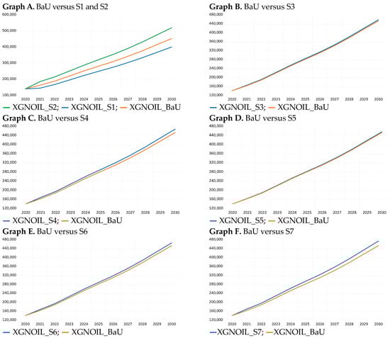 Figure 6 illustrates the projected paths of non-oil exports in the seven scenarios and in the reference case (i.e., the BaU scenario). Table 5 and Table 6 report the percentage deviations of the scenarios (S1–S7) from the BaU scenario.