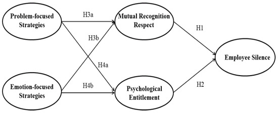 To address these gaps, we explore leaders’ interpersonal emotion regulation (IER), a social process for achieving emotional goals to break the barrier of employee silence. IER was found to be highly relevant to social relationships, through which one could be able to regulate emotions with the support of others [14]. Although leaders’ behavior in promoting employee voice has extensively been investigated [15], to the best of our knowledge, we may be the first to directly investigate leaders’ IER–employee silence link. In addition, we argue that employees’ perception of getting fair treatment, equity, and worthiness could also play a significant role in this regard. For this, we investigated and compared the mediating roles of perceived mutual recognition respect and psychological entitlement. Due to the significant implications of mutual recognition respect in leader-member exchange relationships [16], the mediating role of mutual recognition respect between leaders’ IER and employee silence cannot be overlooked. However, what is less prevalent in the extant literature is the neglected aspect of perceived entitlement perceptions of employees [17]. As psychologically entitled employees are more inclined towards status-seeking and obtaining praise and recognition [18], they tend to create potential risks for maintaining organizational sustainability. In order to encounter these workplace challenges, the other goal of our study is to analyze and compare the mediating roles of perceived mutual recognition respect and psychological entitlement in the leaders’ IER and employee silence relationships.
