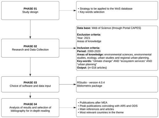 The WoS database was elected for the search, constituting one of the most recognized databases holding high quality standardized academic publications. In addition, this database is recommended for analyses conducted with the Bibliometrix R-package [32]. The search protocol entailed 4 phases, as depicted in Figure 1. The first phase was devising the search strategy to be applied to the WoS database, involving selection of key words for mapping the research area and analysis of articles selected. The second phase involved research and data collection, employing the keywords “climate change” AND “ecosystem services” AND “urban planning”. The search terms were applied to the fields “Title”, “Abstract”, and “Keywords” for the period spanning from 2000 to 2020, covering the following areas of knowledge: environmental sciences, environmental studies, ecology, urban studies, and regional urban planning. Phase 3 involved the analysis and treatment of data using the software tool RStudio (version 4.0.4) in conjunction with the Bibliometrix package. Lastly, phase 4 was performed, in which key articles from the literature were selected for more in-depth reading and critical analysis of results.