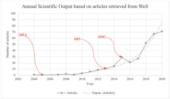 Annual scientific output (2000–2020). Source: produced by authors based on articles retrieved from WoS.