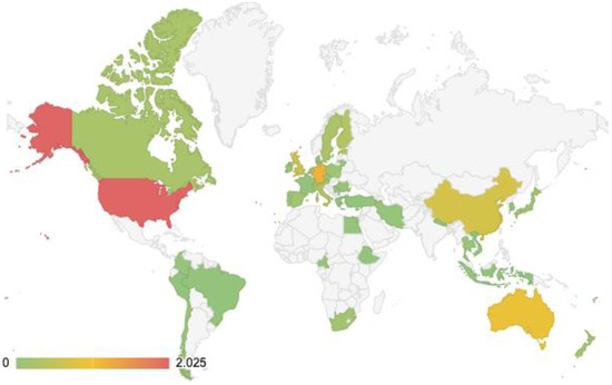 The most prolific authors on the subject were Dagmar Haase (Humboldt University—Germany), Christine Wamsler (Lund University—Sweden), Stephan Pauleit (Technical University of Munich—Germany), Davide Geneletti (Trento University—Italy), and Francisco J. Escobedo (University of Florida—USA). There was major interest in the topic among EU countries, particularly Germany (Figure 5). Latin American and Caribbean countries, however, had low output and few citations on the subject.