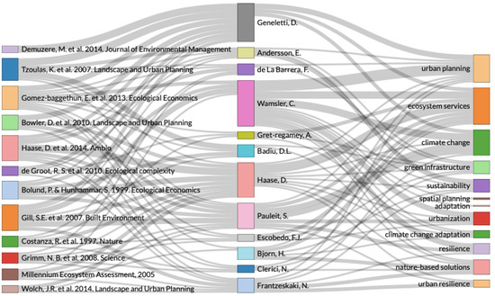 Figure 4 shows the recurrent key words, representing an extended group of the primary terms searched, namely: “ecosystems services”, “climate change” and “urban planning”, to include “adaptation”, “adaptation to climate change”, “resilience”, and “green infrastructure”, illustrating that the terms searched involve different lines of research which seek to reconcile nature and the city with respect to adaptation.