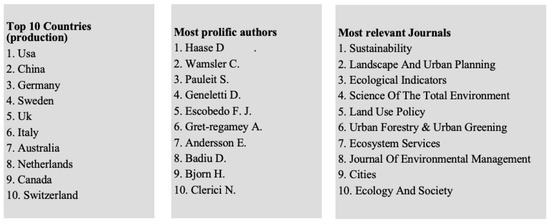 The main journals that published relevant articles in the search period were Sustainability (31), Landscape and Urban Planning (26), Ecological Indicators (18), Science of the Total Environment (17), and Land Use and Policy (14). The journal Landscape and Urban Planning ranked highest for number of local citations (1185), followed by Ecological Indicators (426), Urban Forestry and Urban Greening (371), and Ecosystem Services (356).