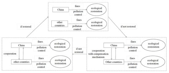Both upstream and downstream countries of transnational rivers can control the amount of pollution discharge and treatment to achieve the purpose of protecting the ecological environment, habitat and natural landscape. Under the separate treatment mode, the upstream countries of transnational rivers make use of their own geographical and spatial advantages, and their ecological destruction and restoration can affect the downstream countries; the downstream countries cannot influence the downstream countries. In order to restrict the upstream countries and achieve the purpose of jointly protecting the ecological environment of the upstream and downstream countries of transnational rivers, the countries in the LMRB can establish a common ecological protection model and a compensation-based common ecological protection model. Taking the common pollution control model as an example, under which the downstream countries can obtain certain economic compensation based on the net emission of the upstream countries, so that the upstream countries have to determine their emission according to the ecological compensation, and the net emission determined by the upstream countries further affects the ecological destruction level suffered by the downstream countries. Therefore, the ecological protection decisions of various countries are in continuous dynamic changes.