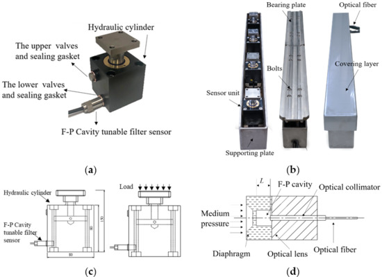 The weigh-in-motion sensors sustain the complex forces formed by the interaction between the vehicle and the road [31,32]. In order to ensure the measurement accuracy and service life of the sensor, the sensor design has three principles. First, the sensor unit should have shock resistance as the support structure of the weigh-in-motion sensors. Second, the elastic deformation of the sensor unit under impact should be as small as possible in order to coordinate with the deformation of the surrounding road surface. Finally, the sensor unit should be able to measure vertical forces exclusively, which means reducing the influence of orthogonal forces on the dynamic response to improve sensing accuracy. Figure 1c shows the sensor unit in which the size of vertical hydraulic cylinder is 80 × 80 × 80 mm and the size of the internal F-P cavity tunable filter is 10 mm in diameter and 30 mm in length.