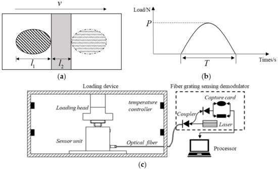 The dynamic load of a vehicle can be converted to a semi-sine pulse load with an amplitude P and a period T [8]. As the width of the sensor is less than the length of wheel paths, the WIM sensor senses a sequence of the vehicle’s dynamic load. The tire loading process on the sensor is as shown in Figure 2a.