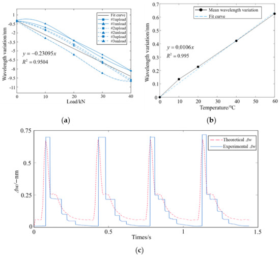Sensor unit signal at laboratory experiment: (a) static loading signal; (b) temperature calibration curve; (c) comparison between theoretical and experimental signal.