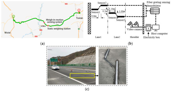 Estimation of vehicle weight and lateral distribution of wheel is a controlling factor in durable pavement structure design for autonomous driving, which significantly affects the pavement’s maintenance costs and the safety of road users [1,2]. The weigh-in-motion (WIM) method may directly identify the load characteristic when the vehicles are in motion. Weigh-in-motion (WIM) is also commonly used in vehicle overload controls and charge freeway tolls [3,4,5]. In freeway management, it is indispensable to guarantee the qualified performance of transportation infrastructure regarding traffic variations according to weather factors [6,7], and determine the freeway toll for each vehicle.