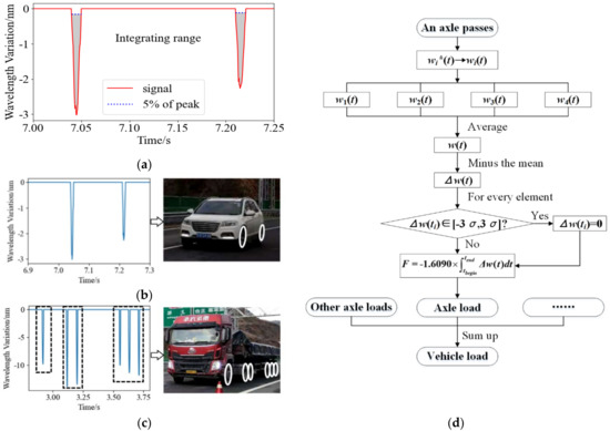 The performance and flow of the WIM algorithm: (a) signal of weigh-in-motion; (b) two-axle passenger vehicle signal and scene; (c) six-axle signal and scene; (d) weigh-in-motion algorithm.