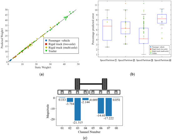 Weight estimation and position estimation: (a) predicted weights against the actual static weight; (b) predicted weight percentage error of predicted weight; (c) position of the tires.