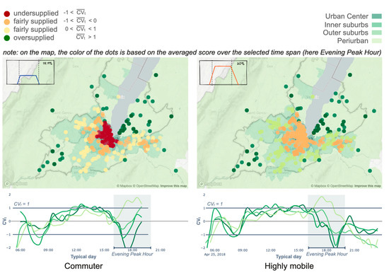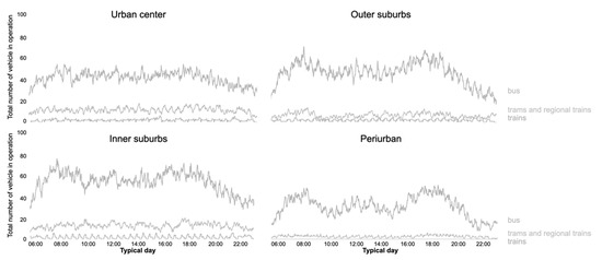 The higher the coefficient of dispersion, the more the number of vehicles varies and fluctuates around the mean. Outwards, the relative variations between the two peak periods and the off-peak period become more pronounced. While a −2% variation is calculated in the urban center between 08:00 and 12:00, the same calculation gives, respectively, −10%, −15% and −24% for the inner suburb, outer suburb and the periurban area. The supply is almost constant in the center throughout the day, which can satisfy any activity-travel pattern. In contrast, the supply outside the urban center fluctuates and does not seem to be able to accommodate the different activity-travel patterns identified in the previous Section 3.3.