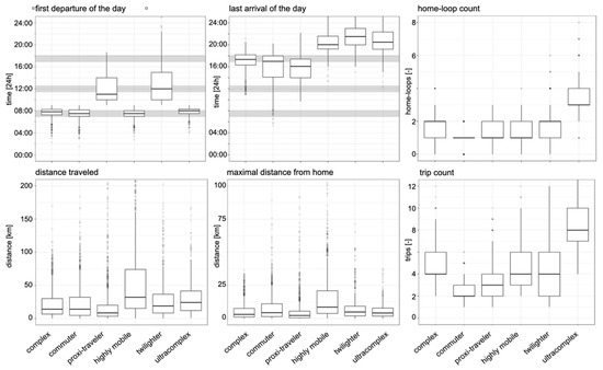 One of the main research questions of this paper is to differentiate mobility needs to capture a greater diversity in activity-travel patterns. Different methods have been reviewed to capture this diversity (see Section 3.2). This research relies on a hierarchical classification, similar to that developed by Drevon and Gumy [24]. This methodology is applied for the first time in a cross-border context. The classification yielded six typical activity-travel patterns. Figure 3 presents the descriptive statistics of some of the explanatory variables used in the determination of the three latent variables that were used as classification inputs. These latent variables are (a) the complexity of the daily activity schedule; (b) the temporal constraints; and (c) the time-space dispersion.