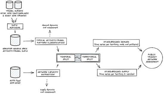 With the combination of different datasets and the comparison of quantities in different units (supply is the count vehicle visits at each bus station, and demand is a volume of travelers), the method is an important development in this work. Figure 4 summarizes the different steps undertaken from the raw travel data and GTFS data to the assessment of the public transport network. The upper part of the flow diagram focuses on the demand. After matching the two travel surveys and extracting typical activity-travel patterns as described before, the travel volumes are segmented per time slots and territorial typology. Similar data transformation is done for the transit supply, as described in the lower part of the flow diagram. Thus, the day is decomposed into 1440 min that fall within 5 time slots, and the territory is split into 5 parts. The rest of the section describes these territorial and temporal splits.