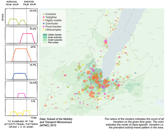 Another approach worth mentioning is the data-driven classification of the activity-travel behaviors. Reades et al. [21] focus on territories and propose a spatial typology based on volumes of visitors at different times of the day. The idea is to classify locations with respect to their temporal occupation profile. This has a clear application for transit planning, but lacks a “social” component, as it is solely based on volumes of visitors. Ahas et al. [22] focus on time and were interested in understanding the locational and temporal diurnal rhythms of suburban travelers. Their results display clear locational patterns and scheduling strategies, which served to define a temporal typology of suburban travel demand. The same approach could be used for urban and exurban populations to better fit the transit supply, or any public service opening hours.