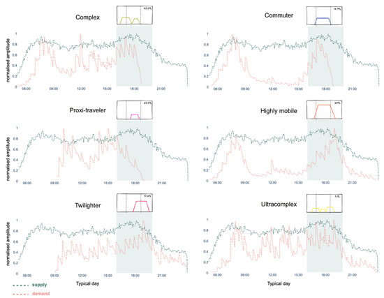 The existing literature introduced above stresses that transit demand does not rely on the seat capacity (i.e., available seats when onboarding buses), but rather on travelers feeling that the journey will be easy, fast and open to flexibility (i.e., number of bus vehicles serving a bus stop). In Figure 6, the demand is segmented according to the six TAT patterns. The “supply” curve corresponds the whole bus transit supply of the Greater Geneva area. Note that the patterns are clearly distinguishable on the demand curves. While in the overall demand analysis, the supply and demand curves are relatively close in shape, with characteristic peak periods, this is no longer the case for the demand segmented with typical activity-travels. Transit supply is not in phase with all activity-travel needs.