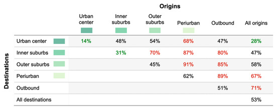 Share of car trips in the travel demand flows from one territory (origin) to another (destination). The aggregated share of car trips in the whole Greater Geneva Area is 53%. This includes walk trips for distances higher than 500 m. The Table’s text color emphasizes high car use and low car use per O/D pairs—in red if more than 2 trips out of 3 are made by car, in green if less than 1 trip out of 3. Note that the matrix is nearly symmetric (+/− 3%).