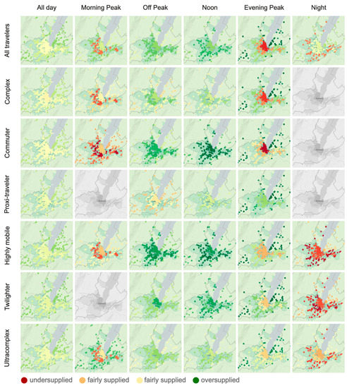 The general trends of the curves are pattern-specific. They oscillate between –1 and +1, which indicates, respectively, an undersupply and an oversupply. For the two patterns depicted in Figure 9, the bus transit is clearly oversupplied in between peak hours whatever the territory. However, the evening peak hour shows a different result. For both patterns, the periurban area is oversupplied and the center is undersupplied. In the morning peak hour, the highly mobile coefficient of variation indicates an oversupply around 6 a.m. and drops to an undersupply before 9 a.m. This is particularly noticeable in the inner suburbs. To simplify the results, such variation will be flattened in the rest of this section, solely based on specific time slots that were introduced in Table 1, namely, the morning peak hour, the off-peak hour, the noon period, the evening peak hour and the night period.