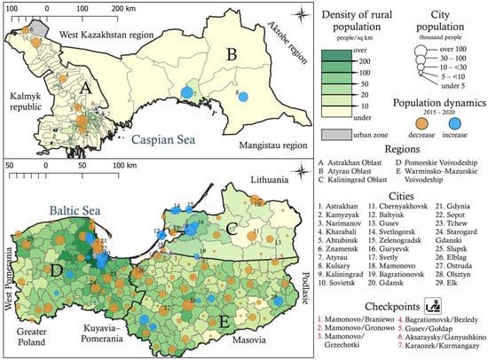 Thirdly, the studied border regions of Russia (Kaliningrad, Astrakhan regions), Poland (Pomorsk, Warmia–Mazury Voivodeships), and Kazakhstan (Atyrau region) have a rural population of a significant size, which makes it important for them to solve the problem of improving the level and quality of life in rural areas and economic development of these territories. In 2020, 226.2 thousand people (22.3%) [49] lived in the rural areas of the Kaliningrad region; Astrakhan region—334.2 thousand people (33.4%) [50]; Pomeranian Voivodeship—863.9 thousand people (36.8%) [51]; Warmia and Mazury Voivodeship—580.1 thousand people (40.95%) [52]; Atyrau region—299.3 thousand people (45.6%) [53]. These regions have similar problems in the development of rural areas, including a decrease in the size of the rural population and its share in the settlement structure (excluding the Pomeranian Voivodeship, where the share of the rural population in 2015–2020 increased slightly from 35.6 to 36.8%), an aging rural population, and a decrease in the share of the working-age population. A significant part of the working-age population, released from agriculture, is drawn by cities; therefore cross-border tourism might be an alternative employment in rural areas of border regions. In the Warmian–Mazurian Voivodeship, there is a noticeable presence of internal migrants from large cities, who treat the rural areas of this region as an alternative to intensive living in agglomerations. Often these are former corporate employees who have decided to live in the countryside and run agrotourism activities. Their advantage is the knowledge of foreign languages and the rules of running a business.