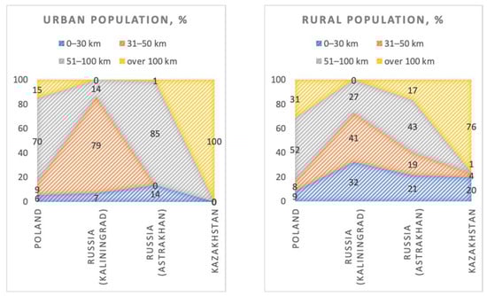 Distribution of rural and urban population in Russian–Polish and Russian–Kazakh cross-border regions by territorial zones relative to their distance from the border, 2020. Source: calculated by the authors based on data [53,65,66,67].